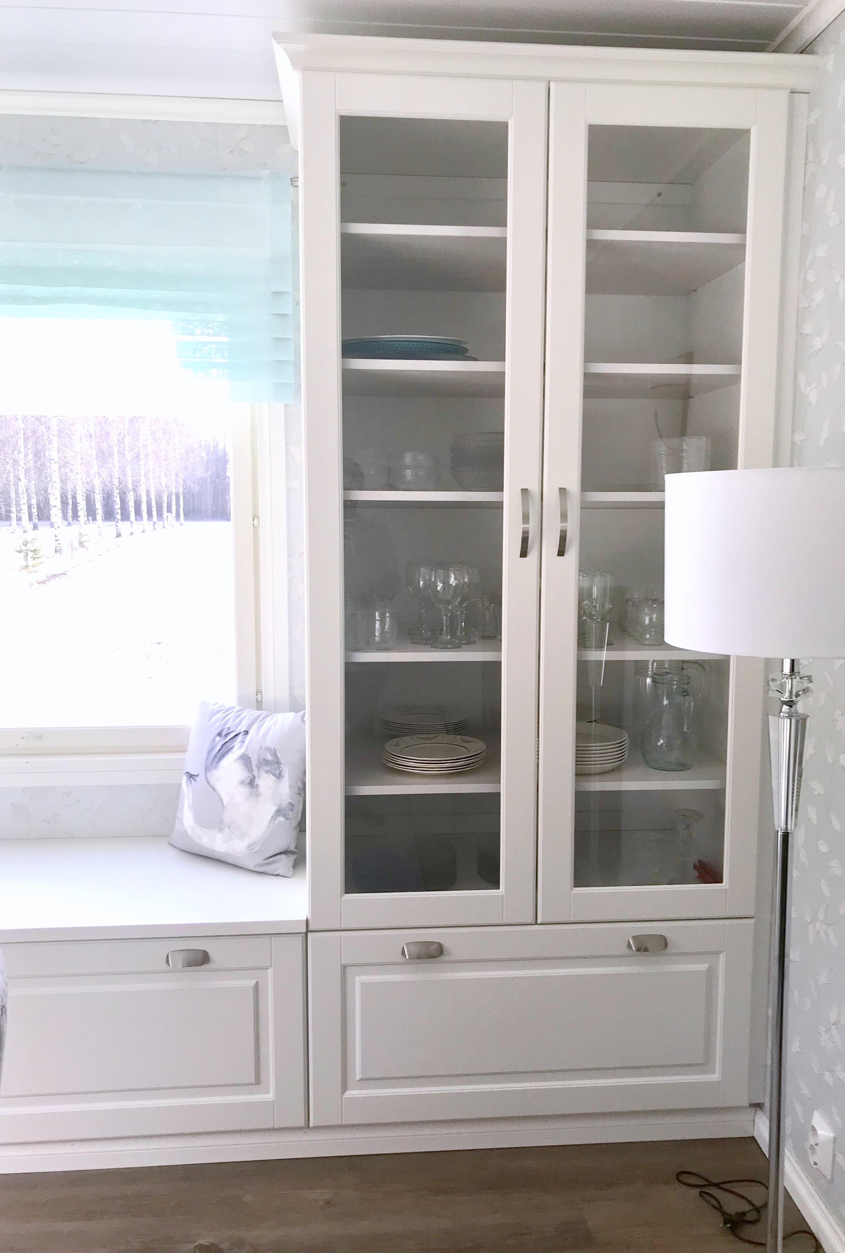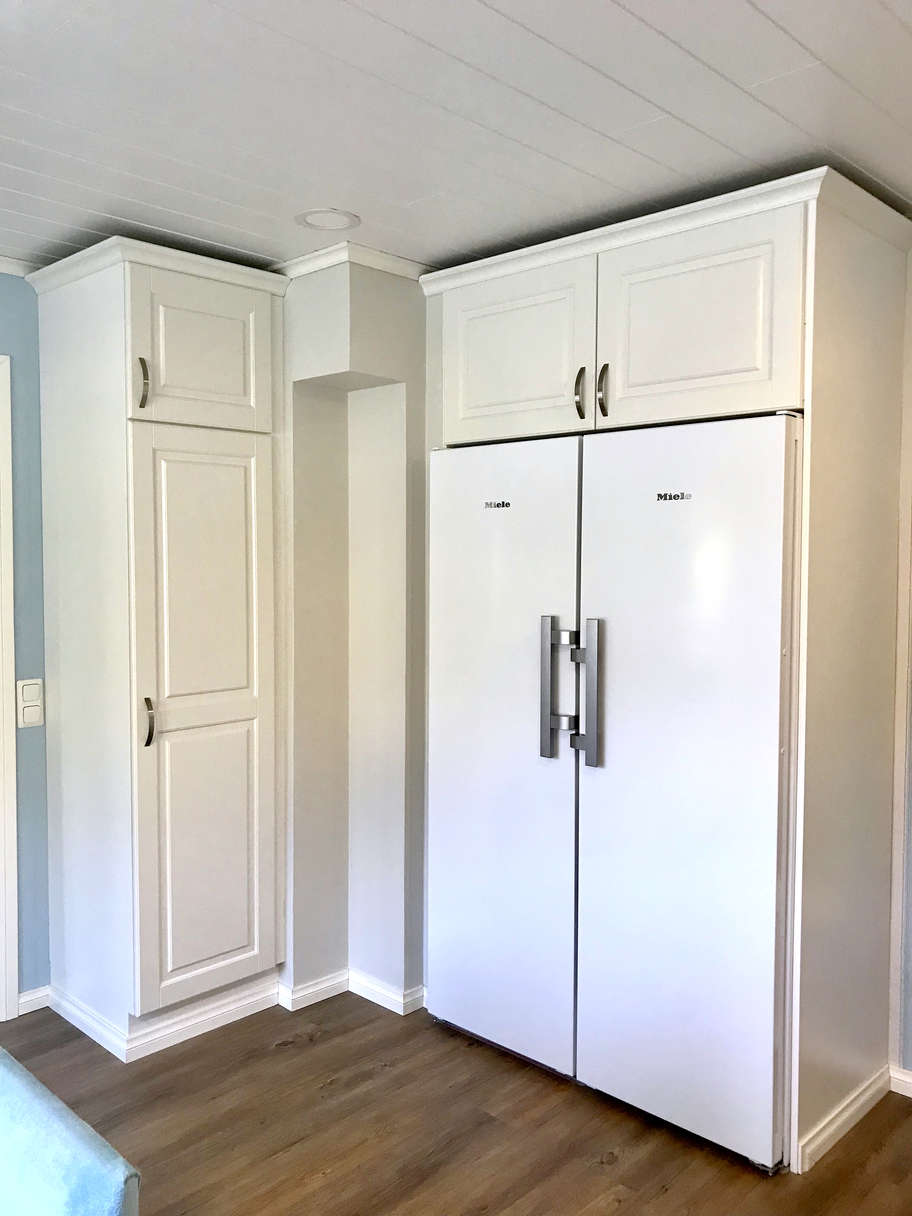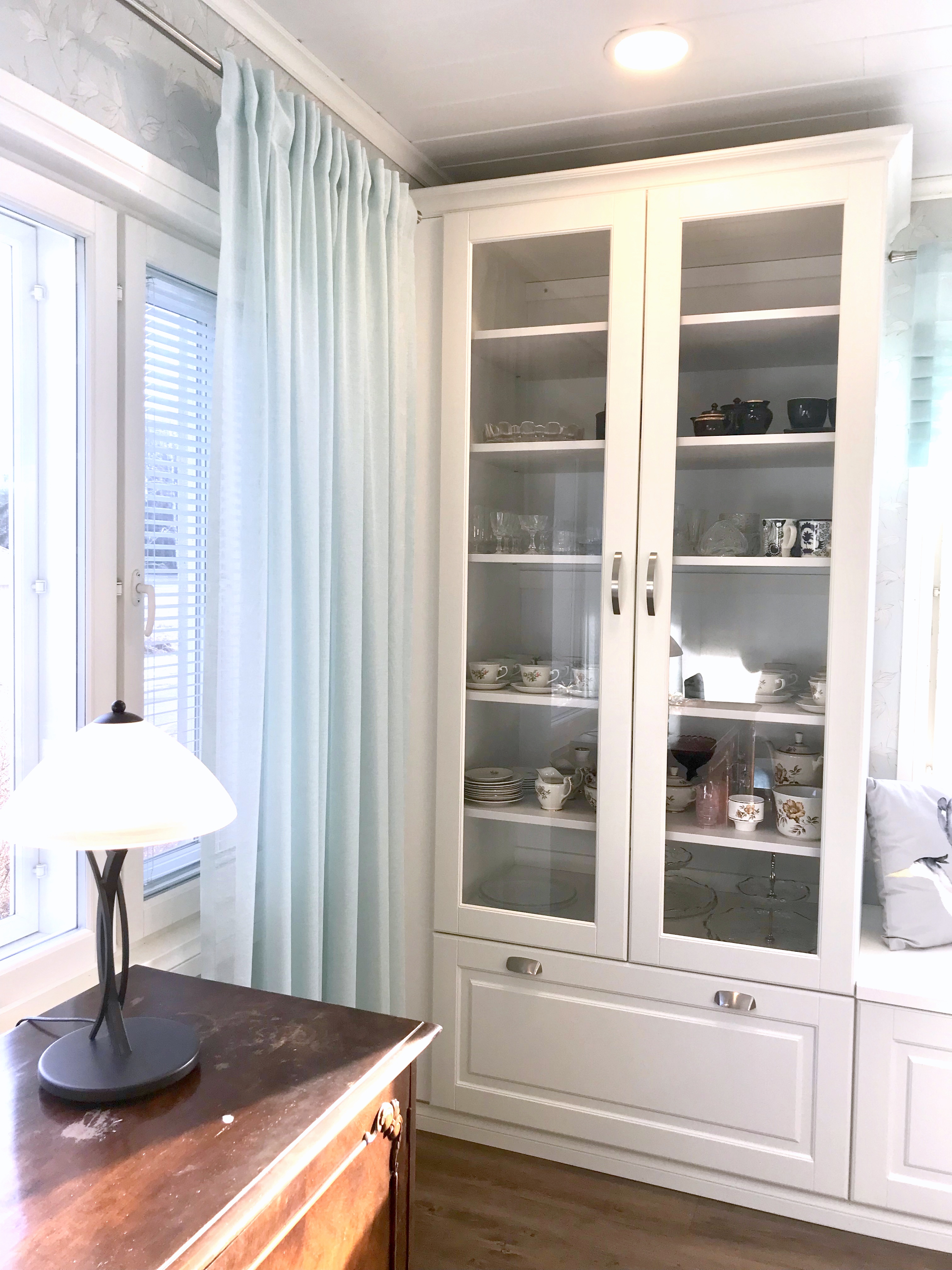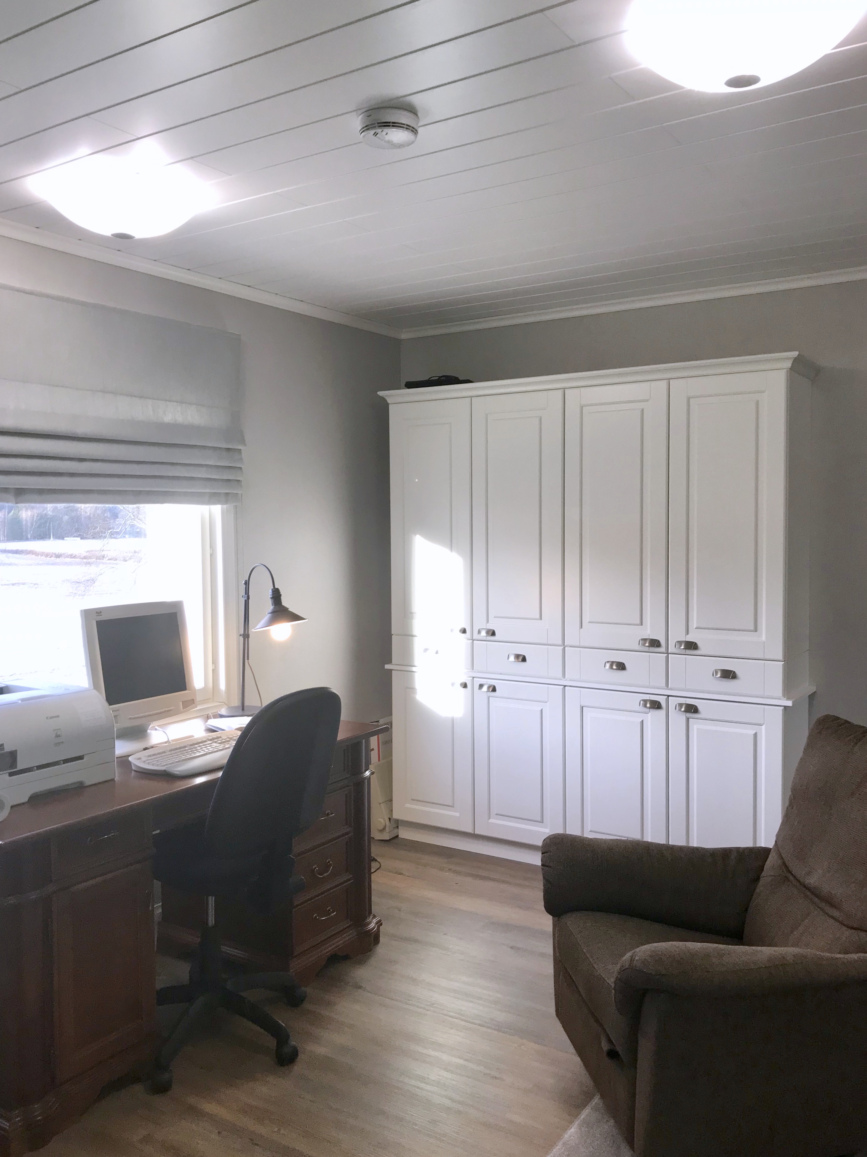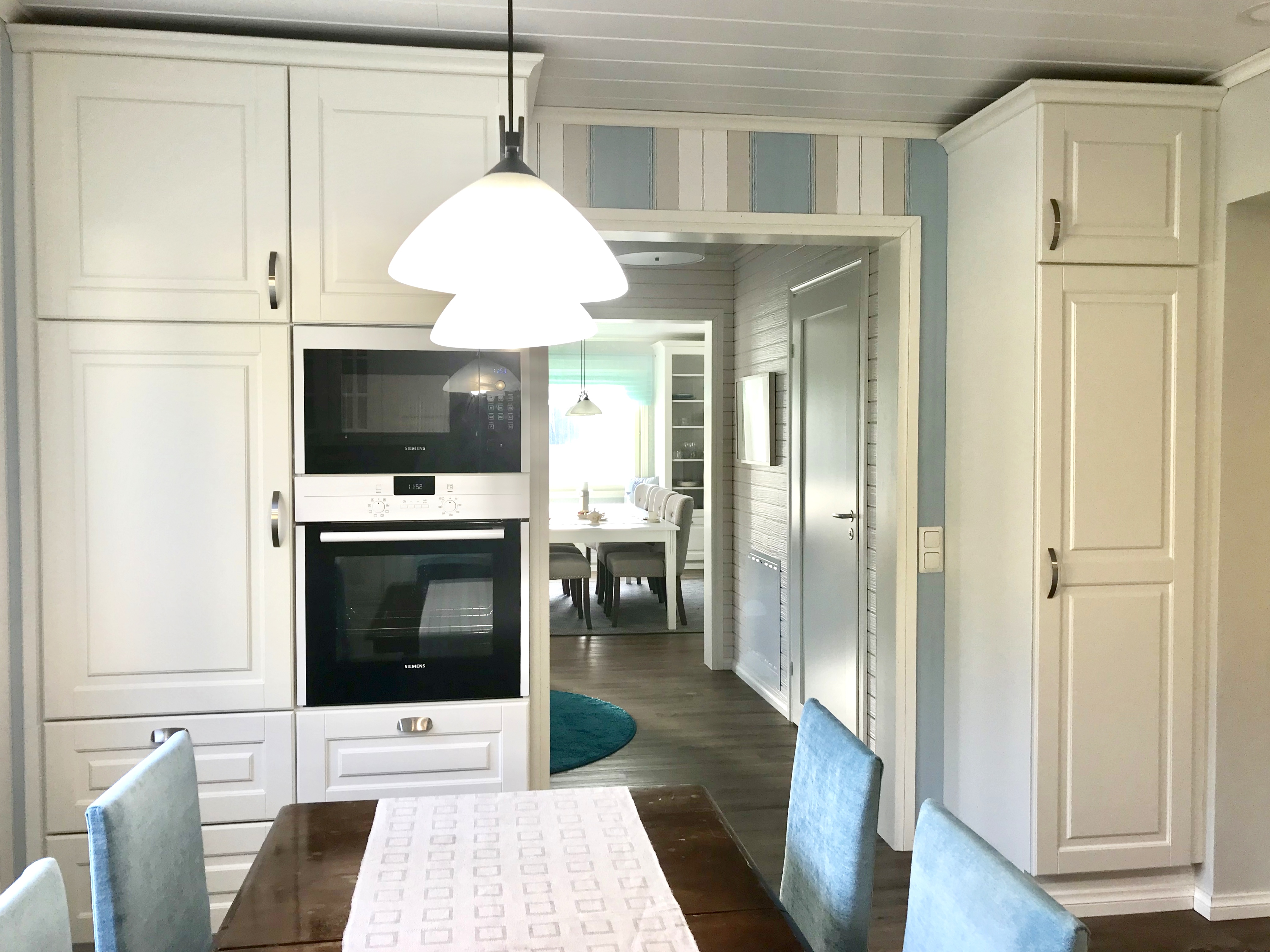 Kaikki kodinkoneet tilattiin paikasta Veikon Kone Somero. Kiintokalustesuunnitelma toteutui millilleen Designkaluste Finland Oy kautta.Niihin sisältyi ruokailutilan kaapistot ja makuuhuoneen kaapistot upeiden istuinpenkkien kanssa, keittiö, työhuoneen mappikaappi ja tv-taso, sekä wc kaapisto, että musta kodihoitohuone alakertaan. Työhuoneeseen myös tilattiin ikkunat, joka tuo valoa porraskäytävään, joka johtaa kodinhoitohuoneeseen ja saunaosastolle alakertaan.