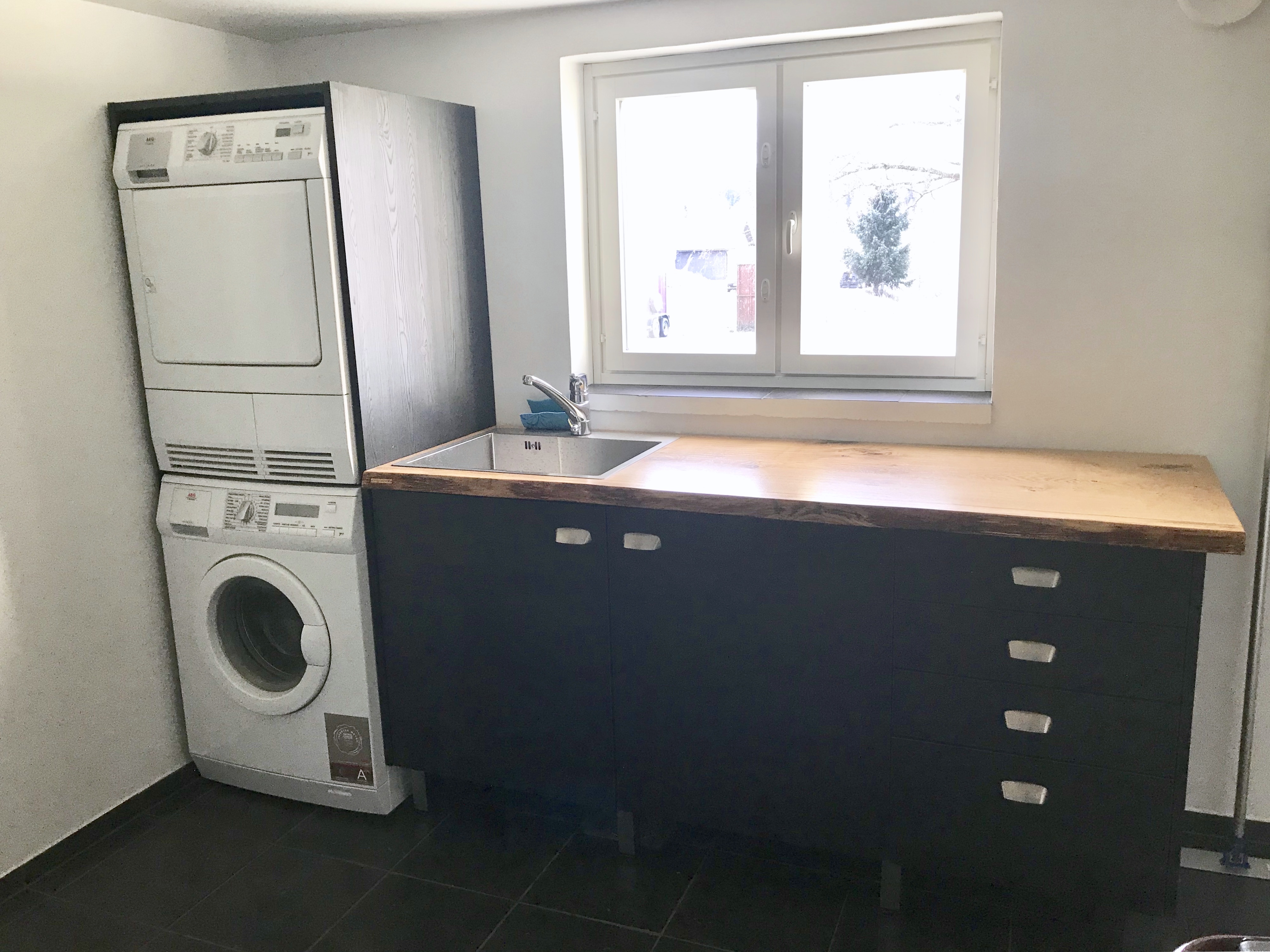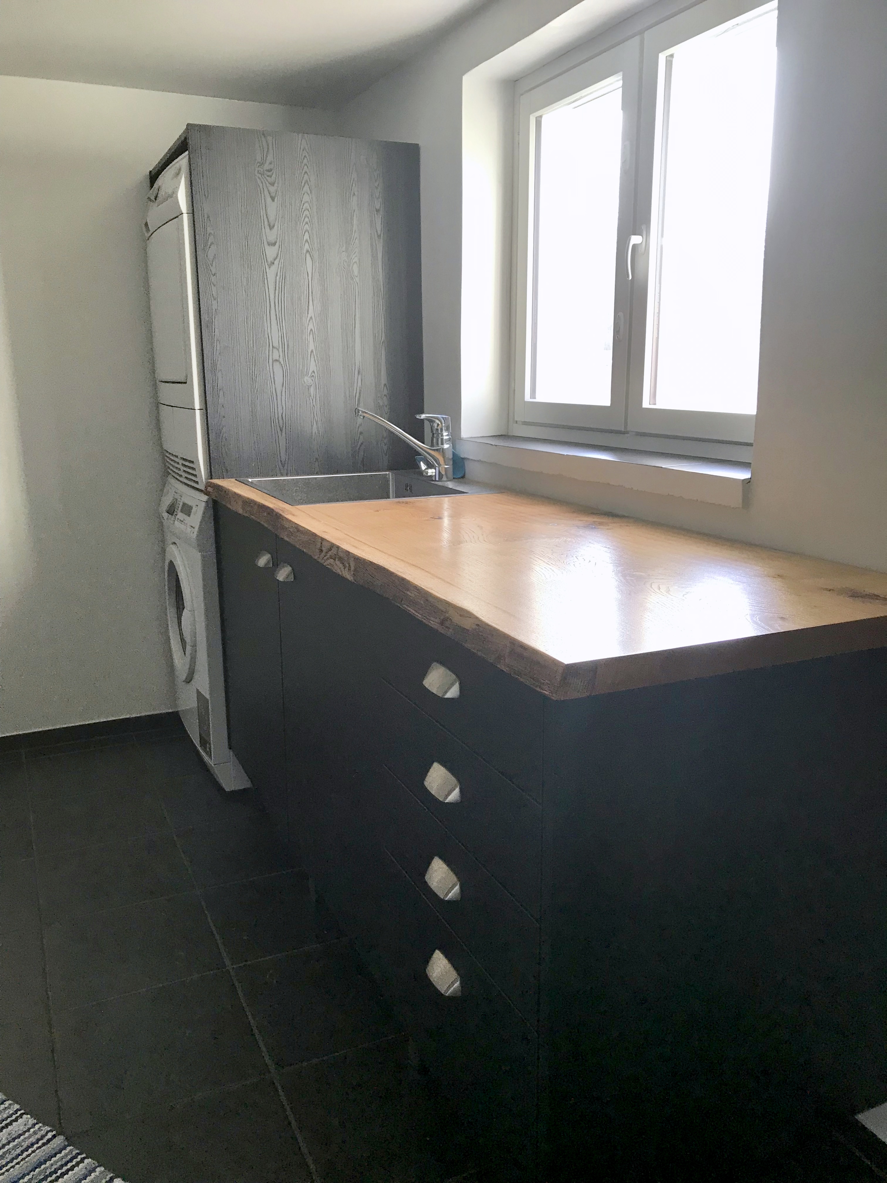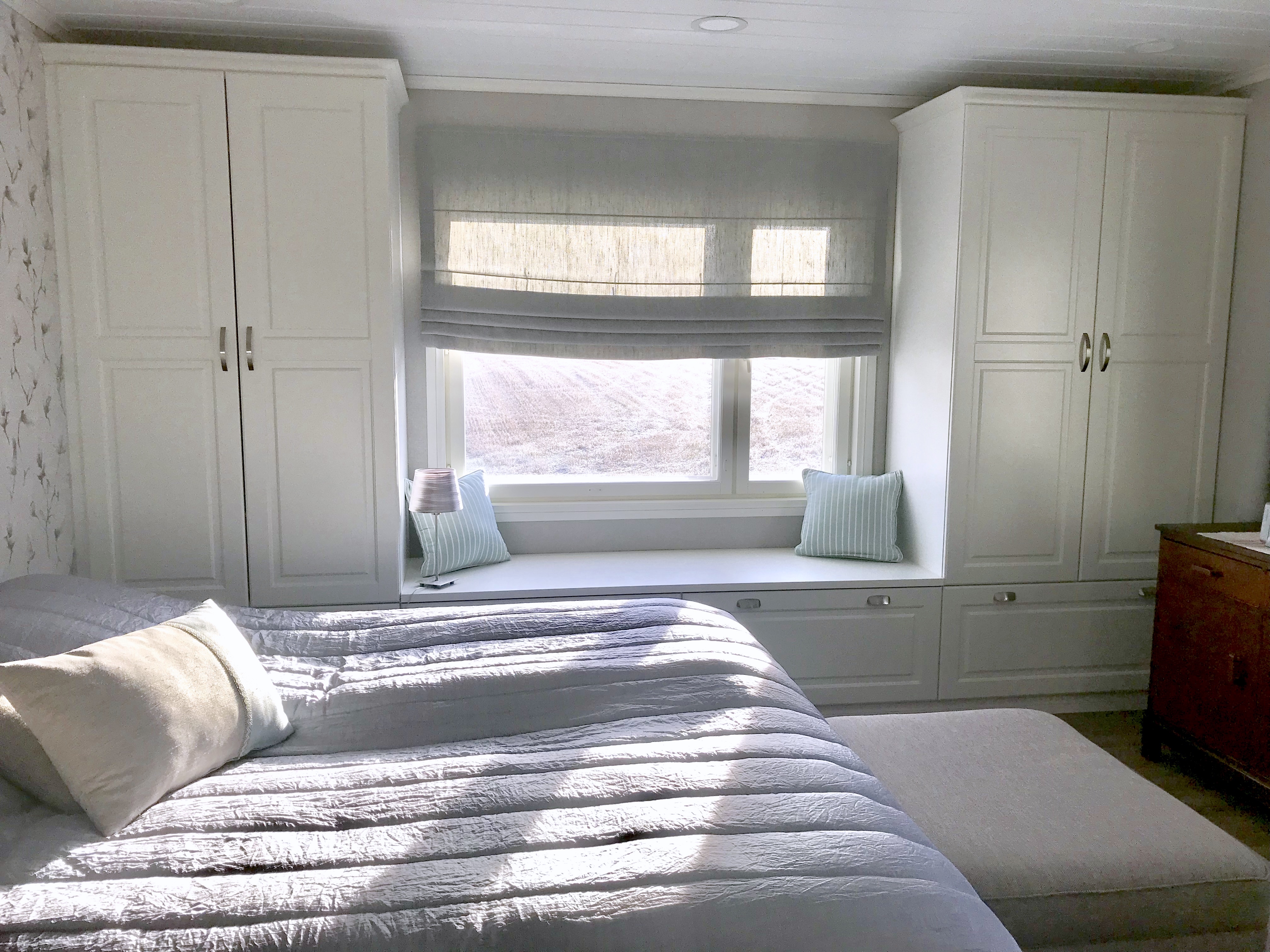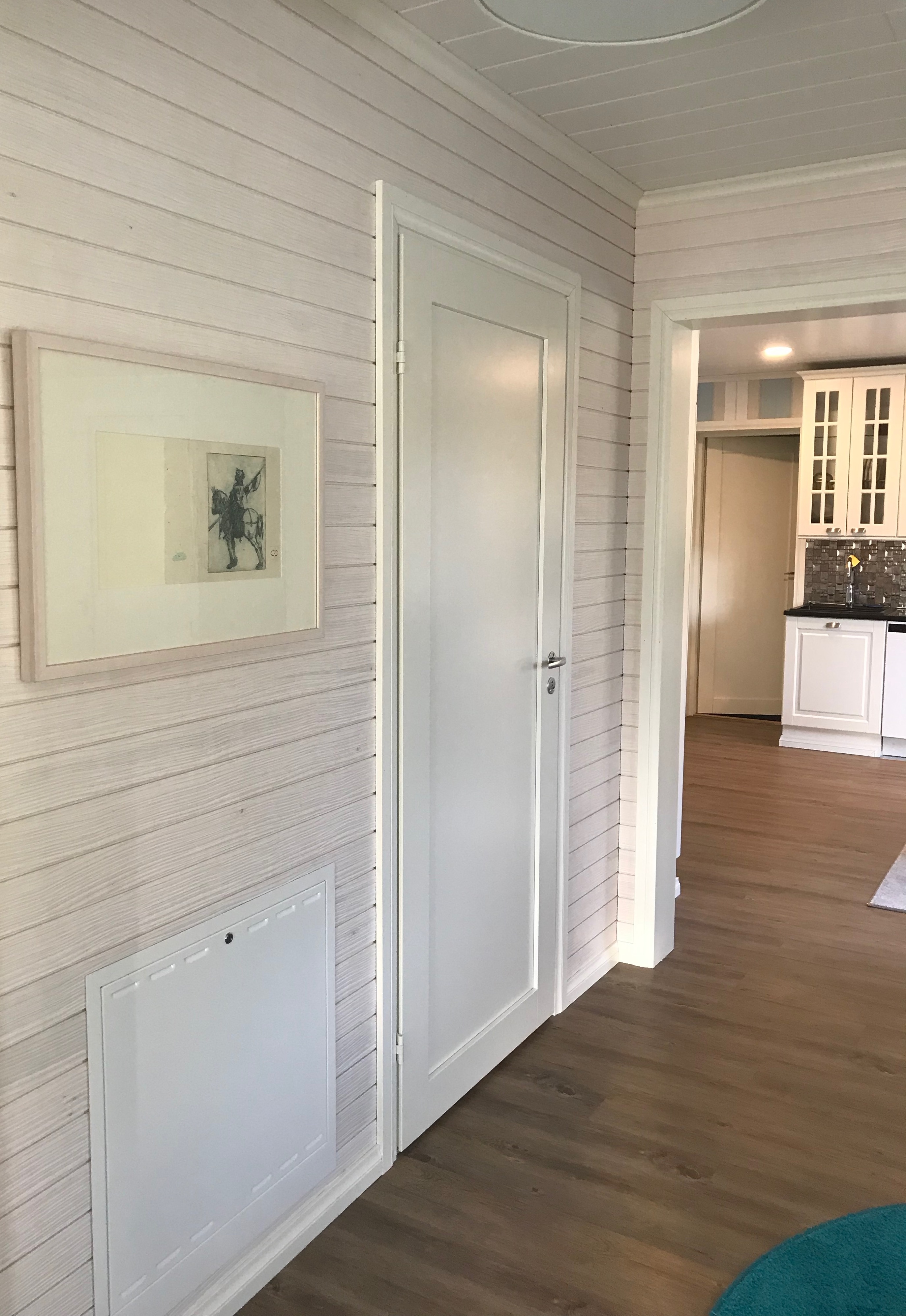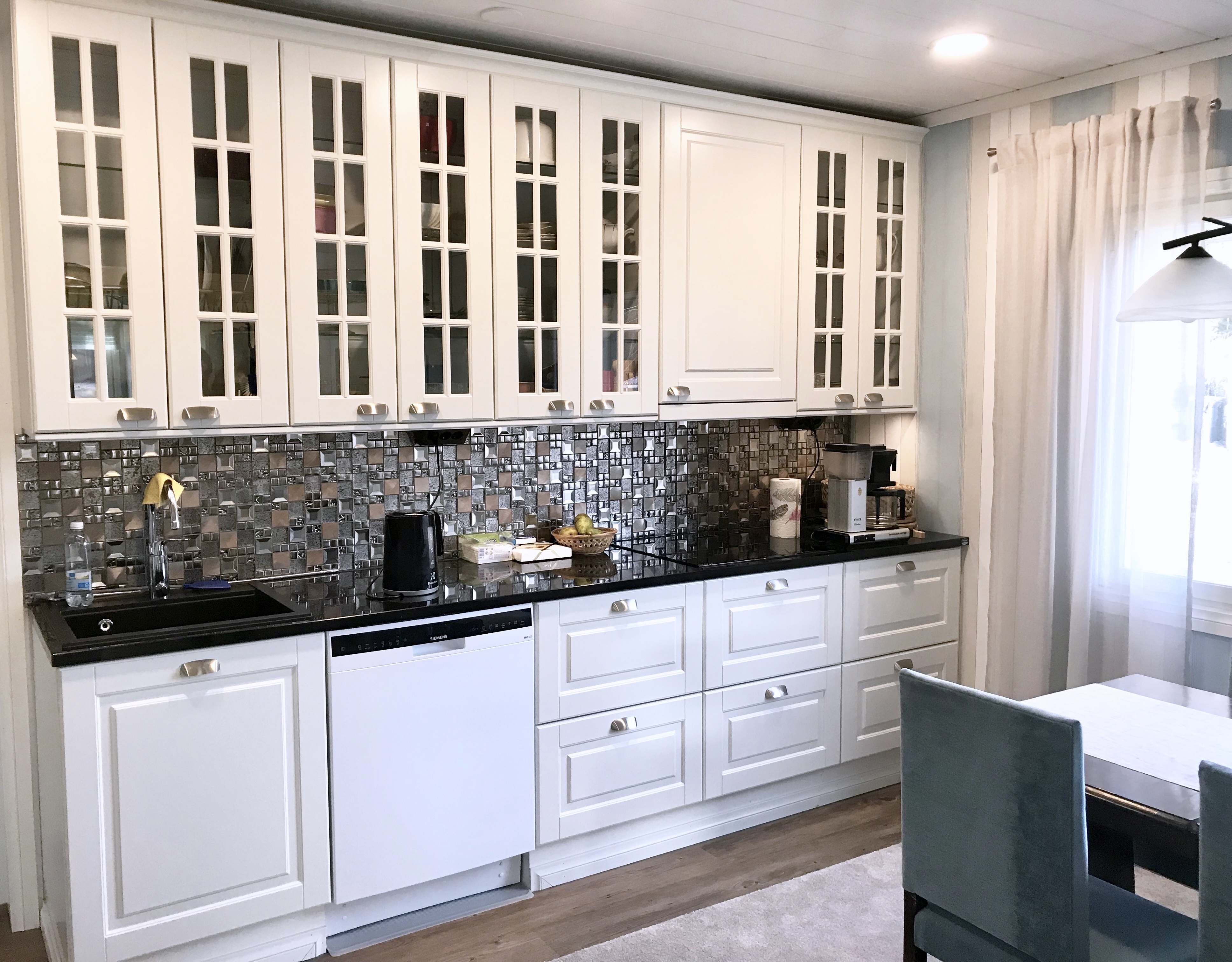 Kaikki kodinkoneet tilattiin paikasta Veikon Kone Somero. Kiintokalustesuunnitelma toteutui millilleen Designkaluste Finland Oy kautta.Niihin sisältyi ruokailutilan kaapistot ja makuuhuoneen kaapistot upeiden istuinpenkkien kanssa, keittiö, työhuoneen mappikaappi ja tv-taso, sekä wc kaapisto, että musta kodihoitohuone alakertaan. Työhuoneeseen myös tilattiin ikkunat, joka tuo valoa porraskäytävään, joka johtaa kodinhoitohuoneeseen ja saunaosastolle alakertaan.