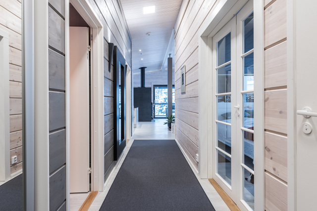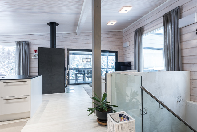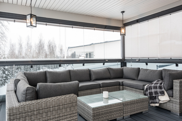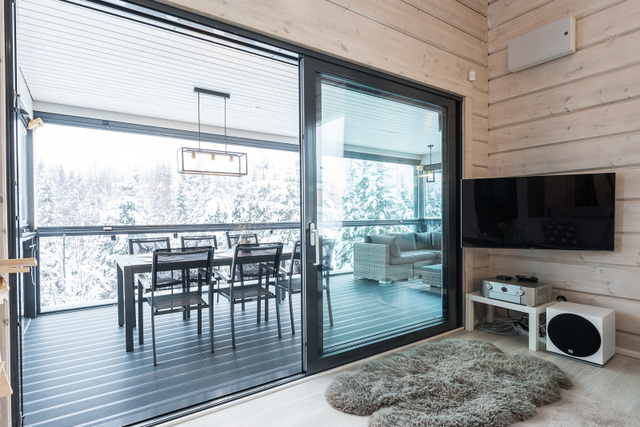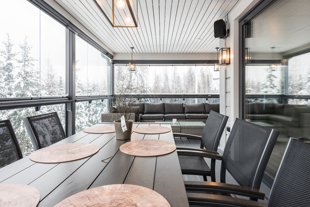 Yläkerran lasiterassi, sisustussuunnittelija Tampere, hirsitalo, kivitalo, kokonaisvaltainen sisustussuunnittelu, Marikan SIsustusStudio, kuvat Vesa Kivimäki