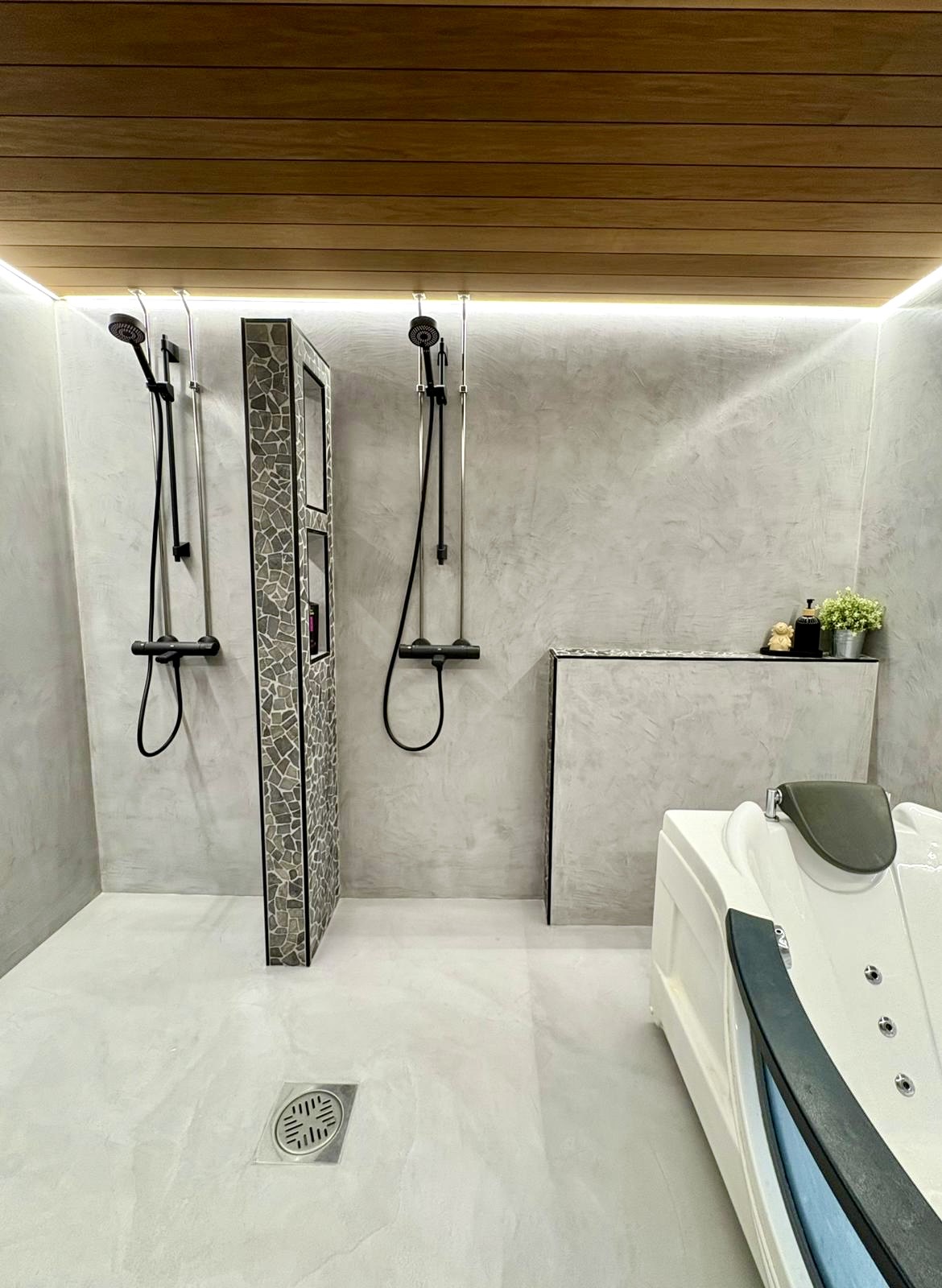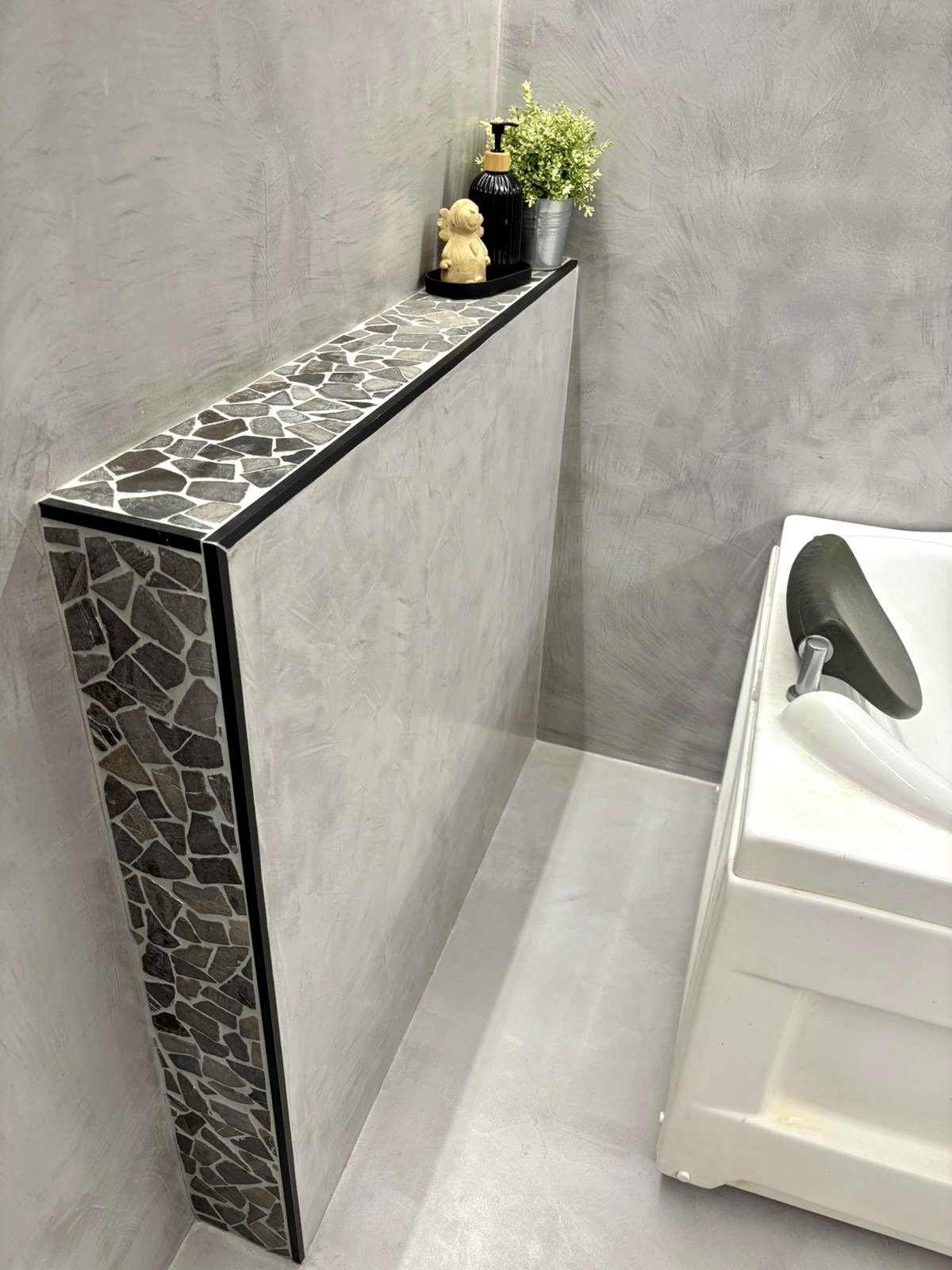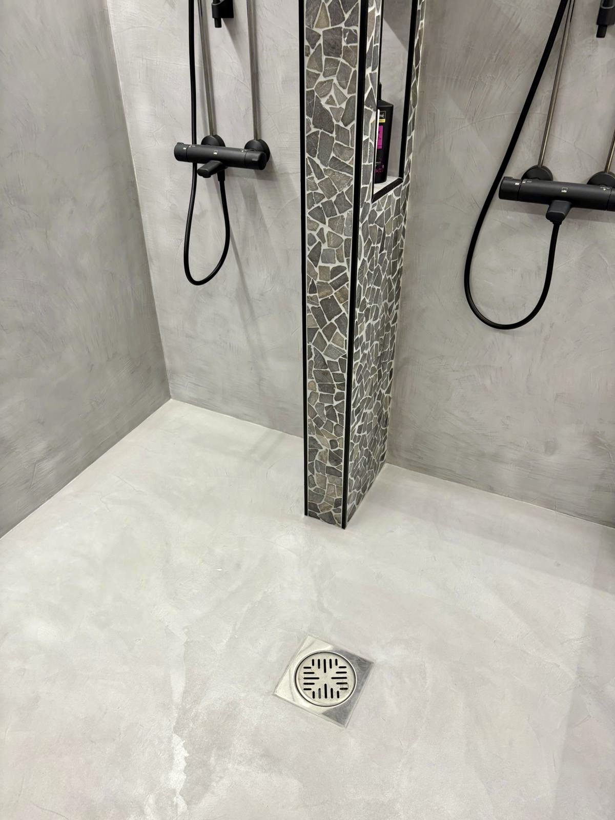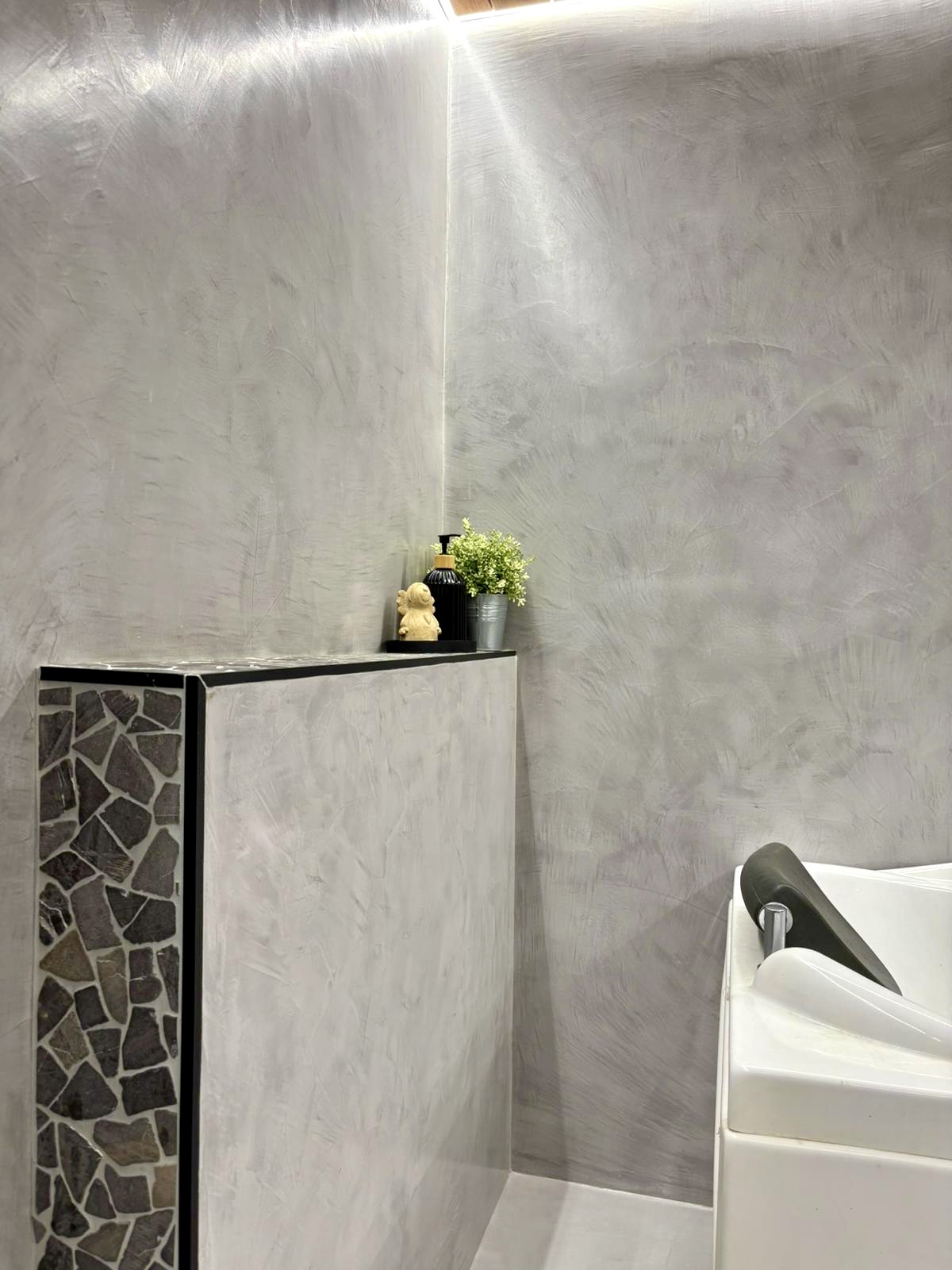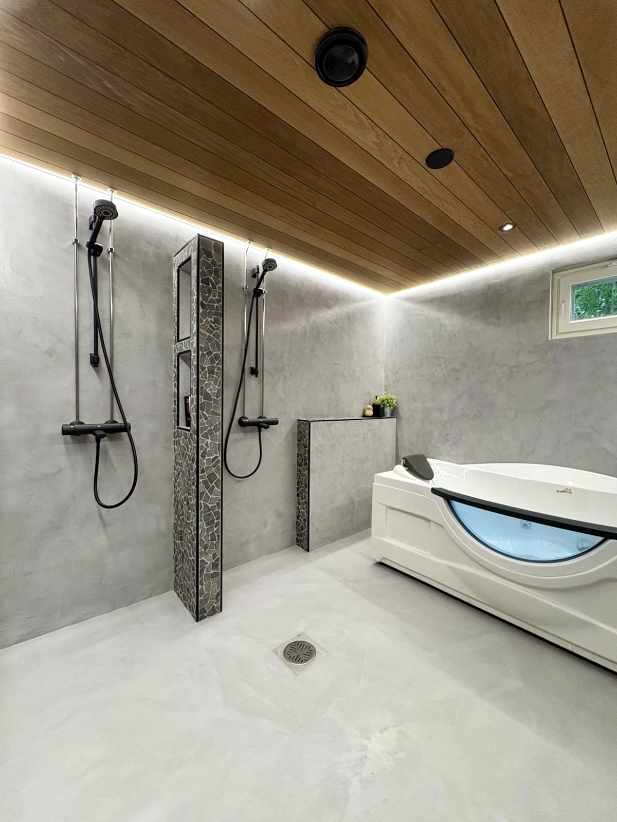 Mikrosementtiä, kivi tehosteita, lämpöpuuta ja upea valaistus 💯