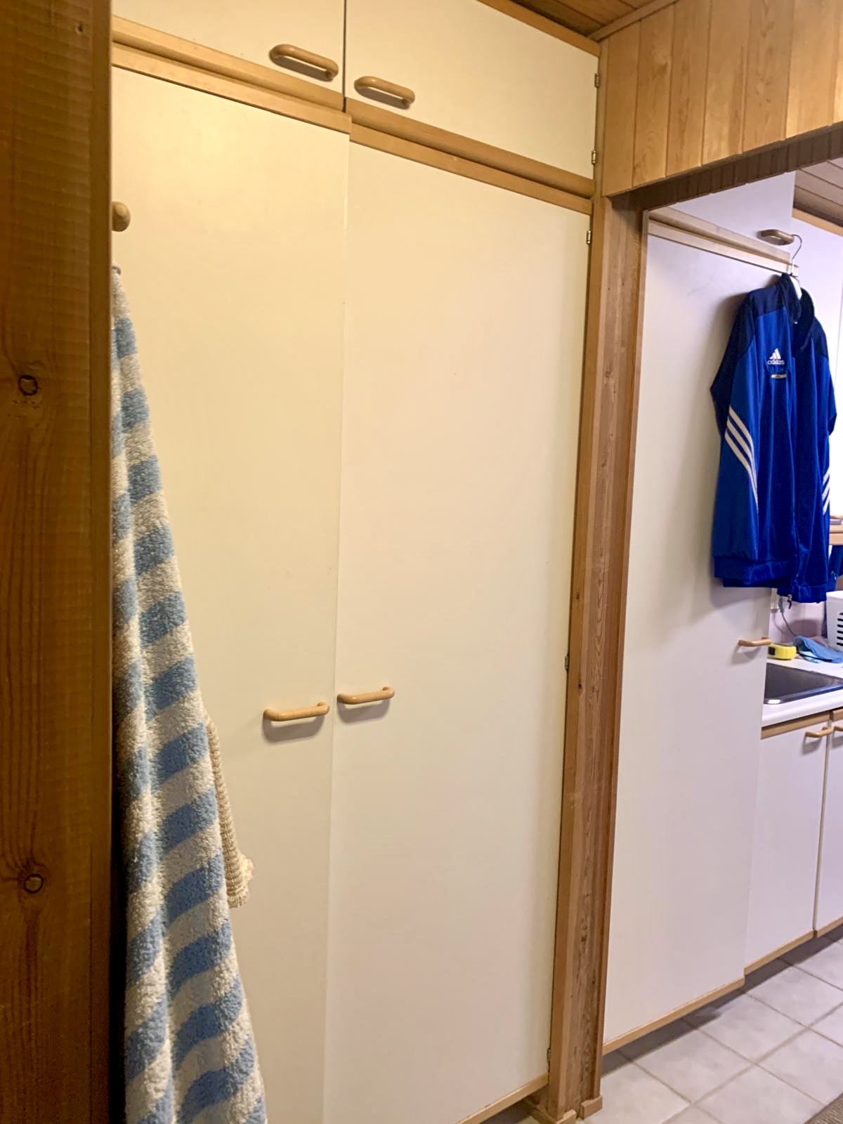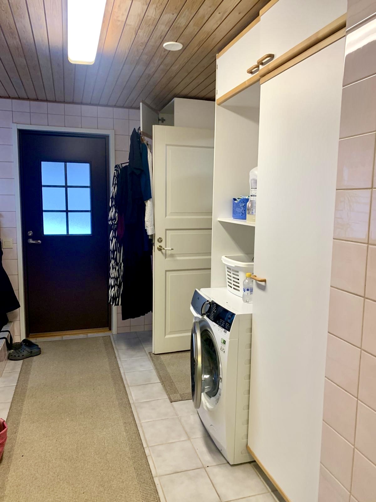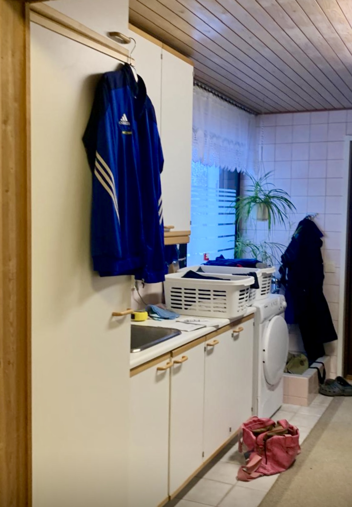 Tampereen omakotitalon kodinhoitohuoneen, pesuhuoneen ja saunan uudistus, kokonaisvaltainen sisustussuunnittelu, sisustussuunnittelija Marika Piekkala, Tampere, Ylöjärvi, Nokia, Pirkanmaa, Marikan Sisustusstudio. Saneeraus Tiilenpäät Oy. Ennen kuvat
