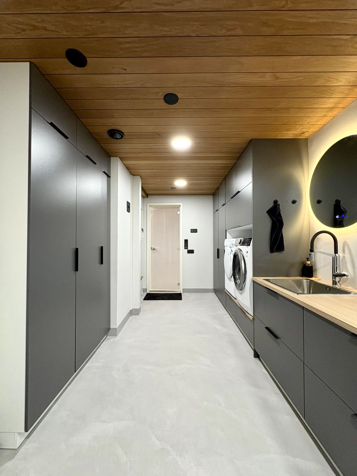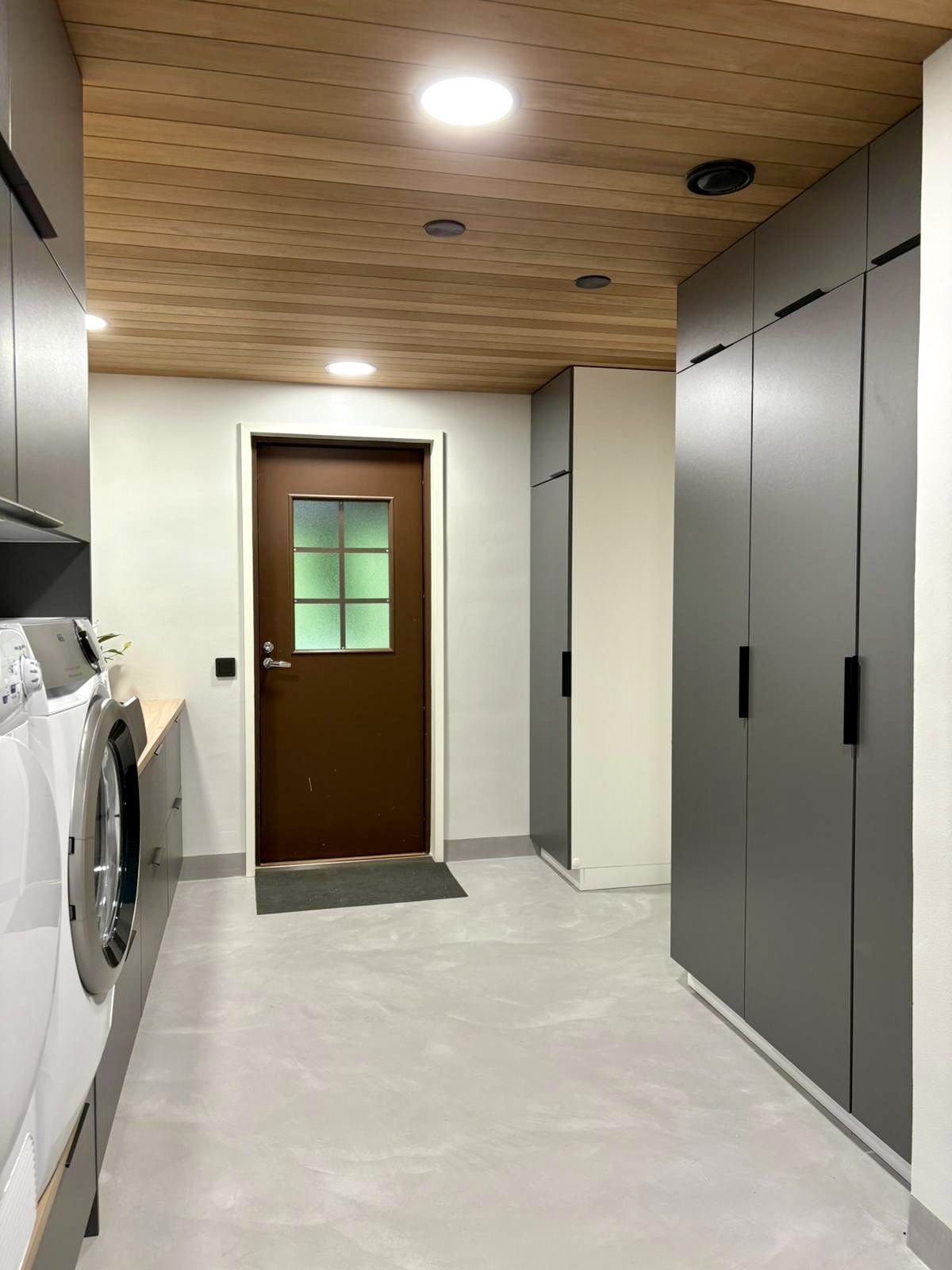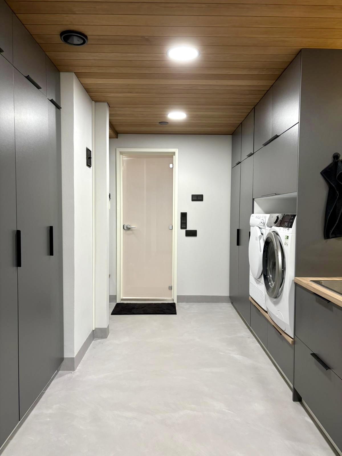 Tampereen omakotitalon kodinhoitohuoneen, pesuhuoneen ja saunan uudistus, kokonaisvaltainen sisustussuunnittelu, sisustussuunnittelija Marika Piekkala, Tampere, Ylöjärvi, Nokia, Pirkanmaa, Marikan Sisustusstudio. Saneeraus Tiilenpäät Oy. Jälkeen kuvat